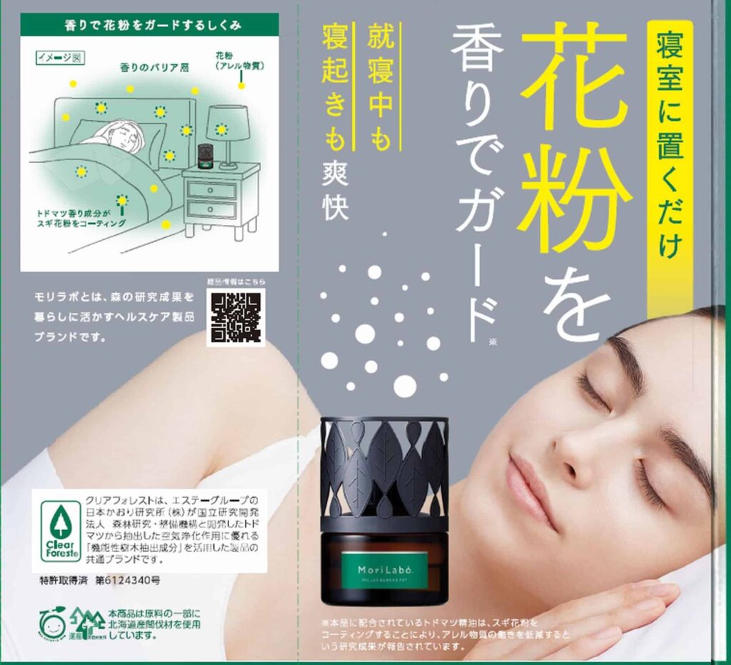 エステーの「Morilabo」という商品には、上図のように「寝室に置くだけで花粉を香りでガード」というコピーがありました。